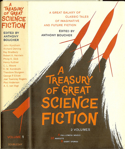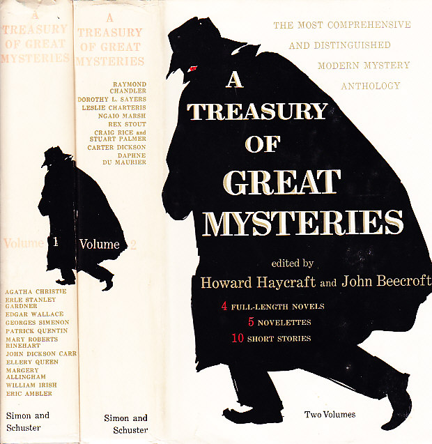 Both these great Treasury of... anthologies (each a 2-volume set) came to me through book clubs, the Science Fiction Book Club and the Mystery Book Club. Back in those days, to get the introductory offer you listed your choices, taped your dime to the response card, mailed it, and got your swag in a couple weeks. The clubs still work much the same way as they did, but, as you might guess, the dime is history. Although the genres are different the anthologies were produced at about the same time, cover the same period of American & British writing, and have similar formats -- a mix of short stories and novel-length tales, an advantage of being spread over two volumes. That there is some genre crossover between the two anthologies is hardly surprising as mystery and science fiction have always been kissing cousins.