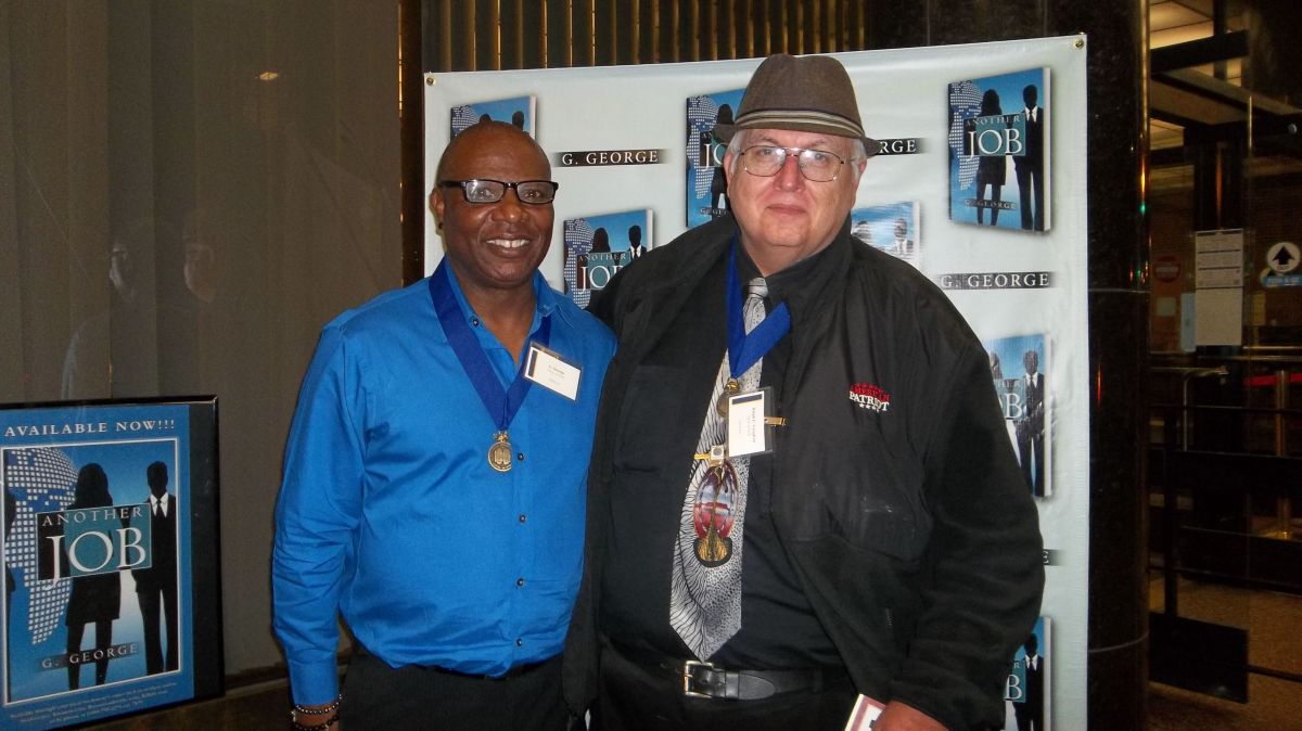 G. George, the author of Another Job, and me, standing in front ofa promotional banner for his book outside the Library.One of the beaming writers was G. George, who wrote the spiritual novel Another Job, the story of a family who suffers through the sort of trials and tribulations that afflicted the Biblical Job, a man whose faith in God was tested sorely, who not only had to suffer the ills tossed him by the Devil, but also the best intentions of his friends. G is a good example of the writer who believes in himself and his book, and is not shy about promoting both. Outside the Library he erected a very large promotional screen and displayed some posters, and was passing out some very well-designed book-markers to everyone as we waited in line to be processed in. No matter what you think of his book (and it seems great to me from what I've read so far) it's hard to argue with such enthusiasm and confidence. G's book is available in hardcover, softcover, and as an e-book, from your local bookstore (if you still have one near you) and the current Goliath of booksellers, Amazon.