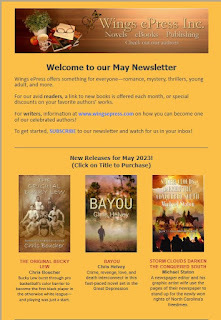 Since November of last year, I've taken on the position of marketing director for Wings ePress. I put together a monthly newsletter and manage social media, trying to attract attention to a talented group of authors. Check out the newsletter here and subscribe.