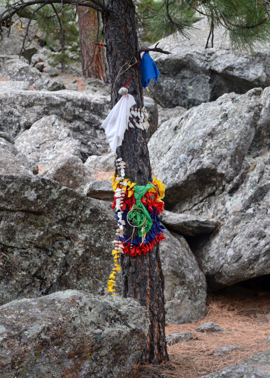 Offerings on treeThe Tower means different things to people. For American Indians, it's sacred ground. They often refer to it as Bear Lodge. You can see offerings left on trees as you trek around the base.For climbers, it's a destination to ascend and descend the (865 feet) in one day. We saw seven the afternoon we visited. That's something I'd never do; I even get a queasy stomach watching them. I learned that there is a voluntary climbing closure each June since Northern Plains Native Americans congregate there for ceremonial reasons.