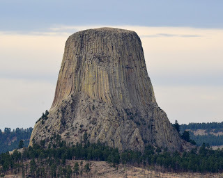 Devils TowerIt is impressive, rising 1,267 feet above the Belle Fourche River and 5,112 feet above sea level. According to the National Park Service, the Tower was "formed by an igneous intrusion, the forcible entry of igneous rock material" about 50 million years ago. It's also laccolithic butte. I took a geology course in college, almost 50 years ago, and that's all Greek to me now.