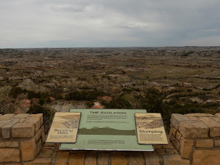 Badlands marker My wife, Mary, and I entered the South Unit of the national park at Medora, taking a driving tour through the Badlands. Then we drove another 70 miles or so to see the North Unit, near Watford City. There is also Elkhorn Ranch Unit, the site of Roosevelt's second ranch, located midway between the North and South Units and inaccessible at times because of unpaved and steep roads (we didn't want to put our Prius through that).