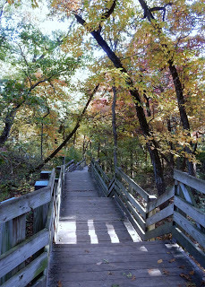 One of easy trails The park, located less than 100 miles south of Chicago, was voted the No. 1 attraction in the state. I couldn't find the source of that ranking but it is a destination that draws 2.5 million visitors annually. I can see why it would be a great place for Chicagoans to escape from the urban hustle and bustle since it contains more than 12.3 miles of hiking trails through 18 sandstone canyons and several waterfalls.The park also has a rustic lodge, cabins, camping grounds, visitors center, and numerous markers to keep you from straying too far off the beaten path. We had hoped to see some beautiful fall foliage like we'd viewed while driving across Minnesota and Wisconsin, but we were probably a week or two early to enjoy the colors.