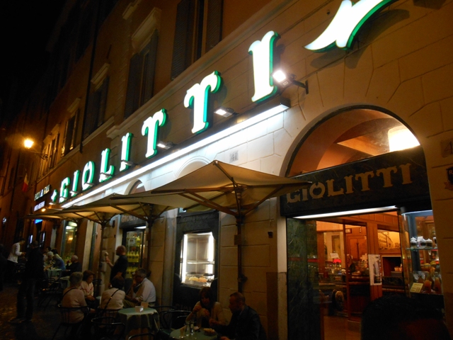 Roma's top-rated gelato parlorWe finished our first day by stopping at Giolitti, ranked as the best gelato (Italian ice cream) parlor in Roma. An interesting aspect is that you pay first, then take your receipt to the counter and tell the server what flavor you want (banana for me, chocolate for Mary). I know it's not historic, but when in Roma, do as the Romans do. Si?