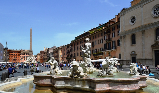 Inside the PantheonWe also walked through the Piazza Navona, a large courtyard with lush fountains and Baroque mansions that attracts artists, musicians, peddlars, and of course, tourists.