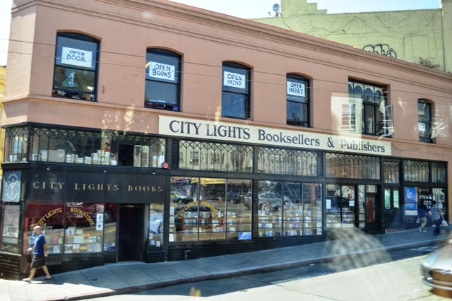 City Light BooksWhile taking a bus tour through the city I saw City Lights Booksellers, founded in 1953 by poet Lawrence Ferlinghetti and Peter D. Martin. The guide said Ferlinghetti, who is 95, often shows up to chat to patrons..
