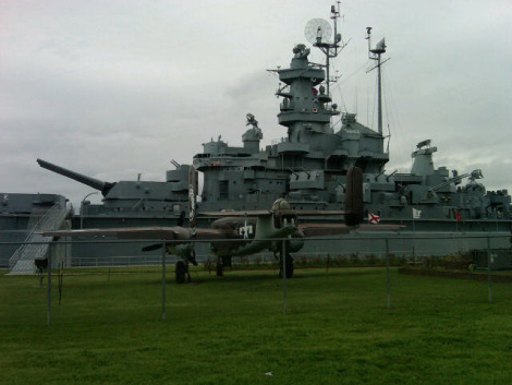 USS Alabama Battleship, B25 Mitchell Bomber in Foreground