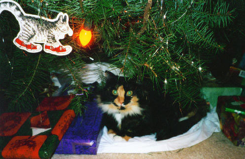 Jellicle Cat (Jelli) likes to nap on the tree skirt under the tree. Probably waiting to drink the milk left out for Santa!