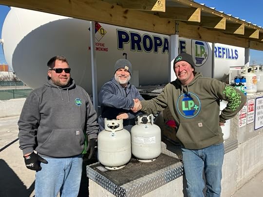 The mix of folks who read my books and attend my shows is reflected in the gifts they share: Homemade preserves; a carburetor for a 1951 International; cookies, lotsa cookies; vintage belt buckles; a plumb bob; work gloves; homemade leather coasters, koozies, and dice cups; ammunition; artwork; knitting; afghans; nice pens; notebooks; KINDNESS. And that’s just off the top of my head as quick as I could type it. But this was a first: When they heard I’d be performing in Green Bay, the fellows at LP+ invited me to swing by and try out their new drive-through LP refilling station. Most of the time I have to politely decline offers like this because of our schedule or other specifics, but in this case it was just a couple blocks away, and by coincidence I had two empty tanks sitting in the garage beside the mighty tour van. So I brought’em along, and not only got’em filled but inspected and cleaned up, as well. I’m not their “influencer,” they were just kind enough to make the offer. I thank them, and wish them luck in their endeavors. (They said they get overrun around deer hunting season, so swing by early!)