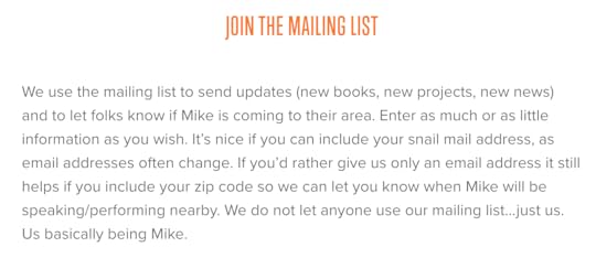 Social media platforms come and go and hiccup. The best way to get the first word about Mike’s new books and appearances is to be on our old-fashioned e-mailing list, which you can join here.