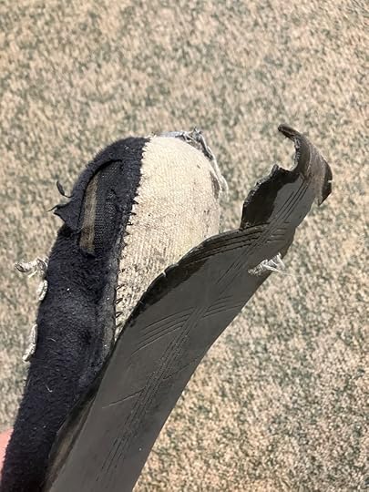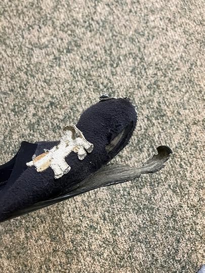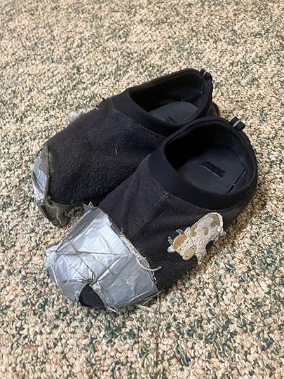 Twenty years ago, after “Population 485” came out, a reader appliquéd cows on these slippers and mailed them to me. They have been in my writing room ever since. Today, after deep consideration, heartfelt review, much double-clutching, and a decade’s worth of duct tape, I have made the call. Farewell good and faithful pair.