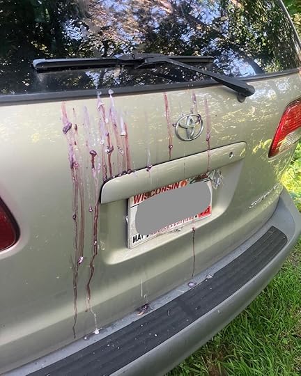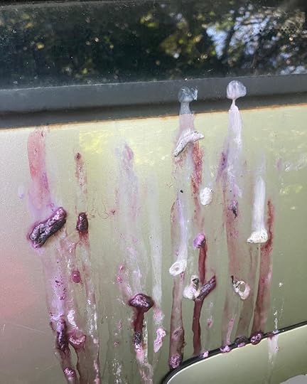 For those of you following along the cardinal has now gone full Hitchcock. Attacking multiple windows, including our vehicles. And apparently eating lotsa berries. Feeling differently about him now than I was when I wrote about him in Hunker: