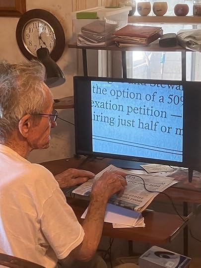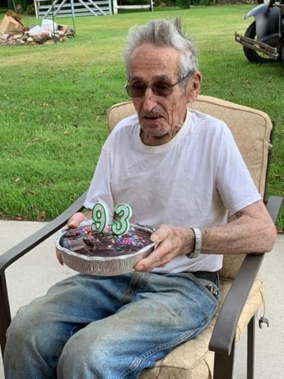 When someone allows me to tell part of their story in a book, I walk a fine line between their story and their privacy. As such I only post the following photos with permission, and because so many of you ask. Yep, the Tom of Visiting Tom is still telling his tales. Told a few at his 93rd birthday party this week. Arlene is gone now, and Tom’s eyesight has failed to the point where he can’t work in the shop like he used to, but he’s got the support of good family and good neighbors nearby (including one in particular, for whom we are most grateful), and he recently got set up with a scanner that allows him to read again.