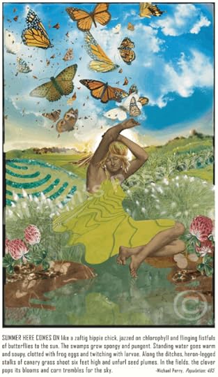 “The opening paragraph of Population: 485 inspired me in creating this collage. The figure in the collage is from a circa 1880’s gravure rendering by Smeeton & Tilly of a statue of Phoebe. A Titan goddess of the moon, worshipped by ancient Greeks, her name derives from the Greek for shining, bright, and radiant.”