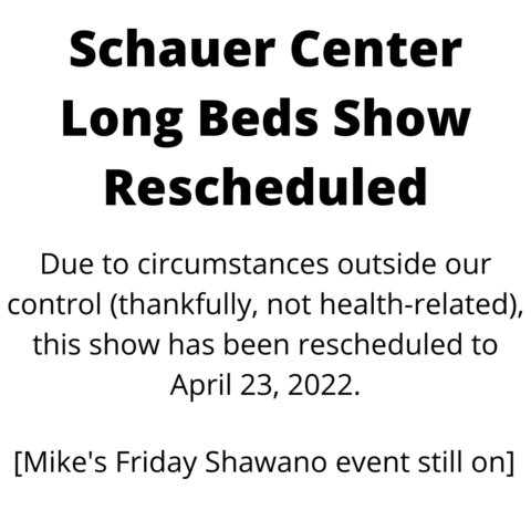 Howdy folks, due to circumstances outside our control (thankfully, not health-related), the Michael Perry and the Long Beds show at The Schauer Arts Center has been rescheduled to April 23, 2022. Mike is still appearing at his Shawano event this Friday, September 17, and he and the band look forward to tunin’ up for you next April. If you pre-ordered tickets, please contact the Schauer box office at 262-670-0560, ext. 3 to exchange your tickets for the new date, request a gift certificate or request a refund.