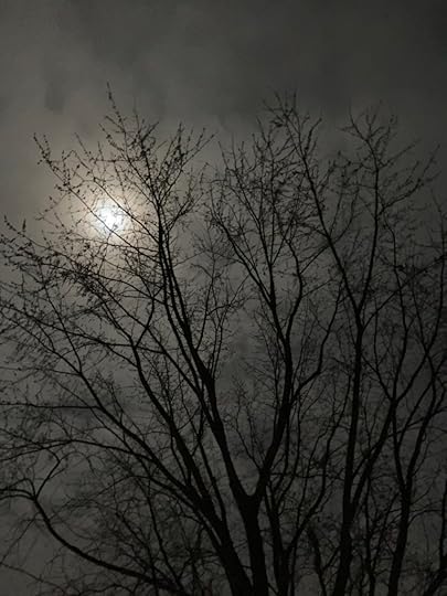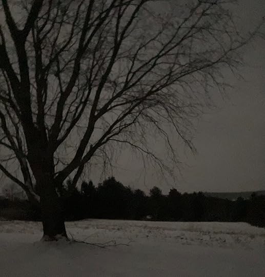 When I walked outside to close things up last night the air was subzero still, the moon was bright even through clouds, this view the source of this scene: