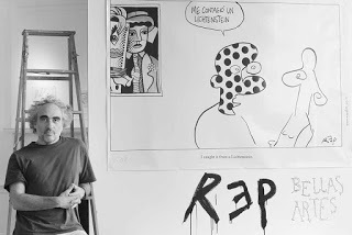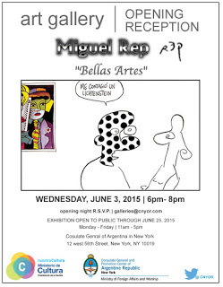 Miguel Repiso (Rep) is an Argentine artist and cartoonist. He is the author of more than thirty books, among them Bellas Artes, Buenos Aires Dibujada, Postales, Contratapas and 200 años de Peronismo. Rep has created nearly sixty popular characters and series. He has been publishing in the newspaper Página/12 from its very first issue and has also written for magazines and newspapers in various other countries, including Veintitrés in Argentina; Playboy in Mexico, La vanguardia and Orsai in Barcelona, Babelia and EL País in Madrid, El Telégrafo in Ecuador and El Tiempo and Soho in Colombia. He has had exhibitions in Argentina, and in Uruguay, Portugal, Germany, France, Spain, Sweden, Italy, Brazil, Chile, Colombia, Venezuela, and the United States. His work has been recognized with awards in Argentina, Spain, Japan, the United States, and Cuba. In 2008 he was named a Distinguished Cultural Figure by the City of Buenos Aires. Since 2003 he has painted some forty murals in hospitals, book fairs, universities, parks, cultural centers, and museums in Argentina, the United States, Spain, Venezuela, the Dominican Republic, Mexico, Chile, Italy, France, Uruguay, Cuba, and Germany. That work includes Mural Treinta (2006); Mural sobre la Transición española (2008); Desconcierto sinfónico (2008) with Luis Felipe Noé, León Ferrari and Adolfo Nigro; Mural del Bicentenario (2010); a mural in the Argentine Pavilion at the Frankfurt Book Fair (2010) and in the Guadalajara Bookfair (2014) and in the Paris Bookfair (2014); Twelve, Human Rights (2012); and Faltan ellos (2012), . In 2011, following his illustration of a new edition of Don Quijote with 260 drawings (first edition 2005, Spanish edition 2009), he painted Murales de Hermanamiento as a tribute to Miguel de Cervantes when Alcalá de Henares (Spain) and Azul (Argentina) became sister cities. More recently he participated in the International Biennale of Architecture in Venice (2012), exploring Argentine architecture on eight canvases. In 2015 he completed 160 illustrations of a new edition of the Divine Comedy, with the first edition in 2015 and the second edition forthcoming in November 2015. A first version of Bellas Artes was exhibited at the Museum .of Latin American Art of Buenos Aires (MALBA) in 2004 (Bellas Artes: Rep & Repiso, curator Laura Batkis ), followed by many exhibitions in Spain, Uruguay, Sweden, and Argentina. In 2014, it was exhibited at the National Museum of Fine Arts (Museo Nacional de Bellas Artes, MNBA), curated by Andrea Giunta (Atlas de Bellas Artes). Now the exhibit is traveling to the Argentine Consulate in New York and the Argentine Embassy in London.