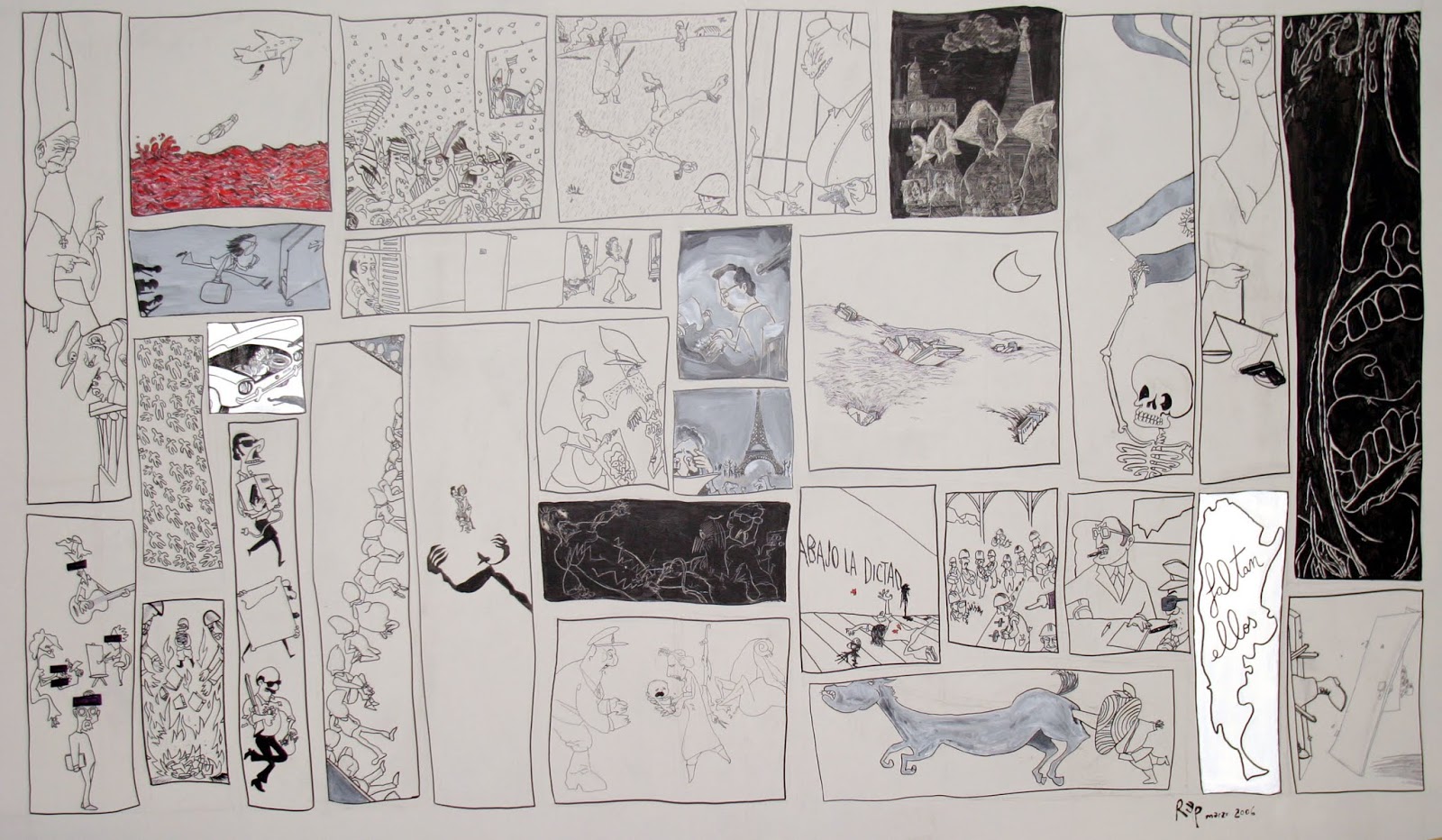 Este mural se llama Treinta. lo hice en 2006, en Rosario. luego se expuso en Arte BA, en Buenos Aires, donde lo vio el embajador argentino en España, Carlos Bettini, y me lo solicitó para llevarlo a la residencia del embajador en Madrid. Se llevó a cabo el préstamo, y la inauguración fue en 2007, ante mucho público. El mural se expuso en el salón principal, frente a un Quinquela Martín, hasta 2015, año en el que el nuevo embajador macrista, Ramón Puerta, lo escondió hasta la fecha. Exijo que ese funcionario, ex presidente por un día, ex todo, devele el paradero de ese gigantesco friso que muestra 30 escenas del período trágico de la dictadura de 1976.