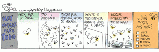 Luego será el turno de la música. Rep suele ir a recitales y, a juzgar por lo que cuenta, su aparente parsimonia nunca le impide terminar metido en bizarreces antológicas. Sus andanzas han ido a parar al fascículo “Intimidades del rock”, que contará asimismo con algunas realizaciones de la época en que el ilustrador integraba el staff del suplemento NO. “Ahí mi laburo era agarrar momentos míticos del rock y revisitarlos; o hacer ‘covers de tapas’, que eran recreaciones de tapas de discos que me parecían interesantes.” Es de destacar que, en el momento en que circularon inicialmente estos delirios, el cruce entre humor y rock era un terreno bastante inexplorado. Nadie sospechaba que –como demostraría mucho más tarde Peter Capusotto y sus videos– podía establecerse ahí una especie de nuevo y pujante subgénero.