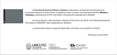 Miércoles 23 a las 17 hs . Conferencia "Humor gráfico y periodismo". Aula Magna. Facultad de Ciencias Políticas y Sociales. UNCuyo. Miércoles 23 a las 20.30. Presentación del libro "Miradas y territorios". MMAMM / Plaza Independencia.