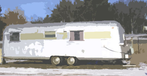 Lester’s front porch sagged like a Sally Ann bargain mattress, and just as stained and worn. Two of the four supporting posts were completely gone and the others had two by fours nailed into the parts that weren’t rotten. He pulled up the half-ton next to a dented airstream that I recognized right away.