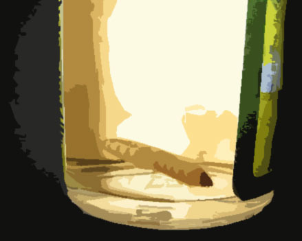 I reached under and pulled out a dusty bottle, no label, just some yellowish liquid. Oh yeah, and the worm curled up at the bottom.