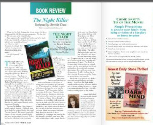 I've really enjoyed writing a book review and crime safety tip column this year. This month I've reviewed The Night Killer by Beverly Connor. Click here for the pdf or digital version. You will find my column on pages 32-33, but don't forget to check out the other articles.