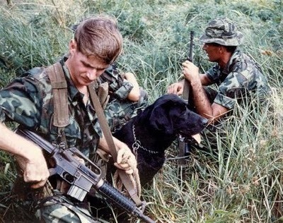 An "actual" Vietnam combat tracker, Ed Wheeler and his four-legged tracker Sam, who just happens to be a black Labrador retriever, has graciously lent me the photo for this article. This photo was taken just after they landed by helicopter in Vietnam.