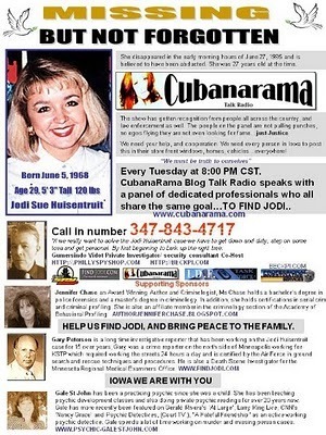 The idea for the Cold Cases Radio Show was born after a heart to heart conversation I had with my daughter about missing children, women and men. I mentioned Jodi Huisentruit during the conversation and that evening Jodi's picture was engraved in my mind, it was like a song that played over and over and over. I called PI Gumersindo Vidot and told him I had an idea for a missing person's show and I wanted him to be a part of it. Gumersindo put together a team of experts I could have only dreamed of, Award Winning Author and Criminologist Jennifer Chase. Most known for her work in missing person cases Psychic & Medium Gale St. John. Death Scene Investigator for the Minnesota Regional Medical Examiners Office and Co Investigator from FindJodi.com Gary Peterson.