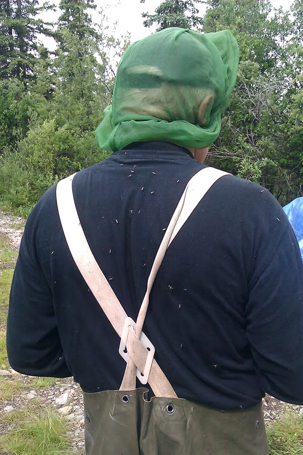 Here's a view of my back while standing out in the subdivision. Jenn seemed impressed by the number of mosquitoes I attracted moments after taking off my rain jacket. This was a particularly buggy trip. The head nets provide relief even if you use deet repellent (which I don't).