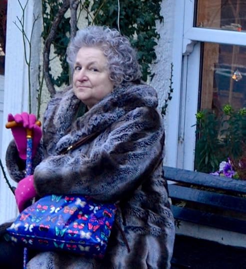 Meanwhile, here’s a photo my friend Ellen took of me in Hay on Wye last month. The Silver Fox curls itself with no help from me. The fur coat is totally fake, I promise.