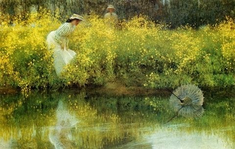 Now isn't that gentleman going to rush to her aid?A Victorian lady in a flowery meadow by artist, Arthur Hacker.