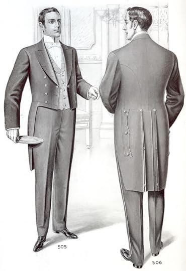 'livery,' or household uniform of fancy coat, knee breeches, stockings, and powdered hair, a costume that endured to the end of the 1800s. Because of their appearance at dinner and in public with the family, footmen were supposed to be the most 'presentable' of the male servants. They were evaluated on the basis of the appearance of their calves in silk stocking, and they often gave their height when advertising for positions in the paper–it was considered absurd to have a pair of footmen who didn’t match in height. (Poole, p. 221)