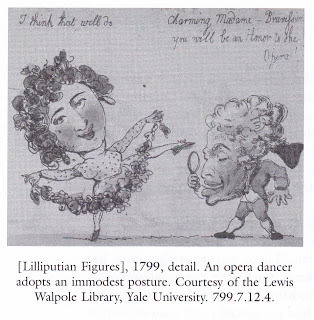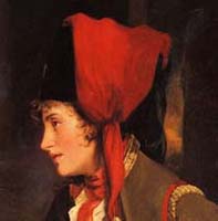 Dorothea Jordan, had a long-running and much-publicized affair with the duke of Clarence, bearing him ten children. (Jane Austen saw her perform at Covent Garden in 1814. One satirical cartoon shows her in her bedroom, gazing adoringly at a duchess’ coronet, which she hopes someday to wear by marrying her lover. A map on the wall purports to show the route from “Strolling Lane” (i.e. prostitution) through “Old Drury Common” all the way to “Derbyshire Peak.” A genealogical chart of the nobility lies on her dressing table, and her bed-hangings are crowned by a Phrygian cap, symbol of the French Revolution. The latter is intended to ridicule her pretensions to nobility; as a common woman, let alone an actress, she should know her place.