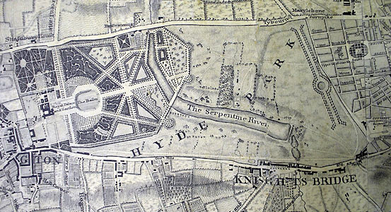 The Serpentine takes its name from its snakelike, curving shape. Detail of the 1746 Rocque map showing the newly constructed Serpentine. The paths converging on the Round Pond to the west of the lake are also visible.Although it is common to refer to the entire body of water as the Serpentine, strictly the name refers only to the eastern half of the lake. Serpentine Bridge, which marks the boundary between Hyde Park and Kensington Gardens, also marks the western boundary of the Serpentine; the long and narrow western half of the lake is known as the Long Water.