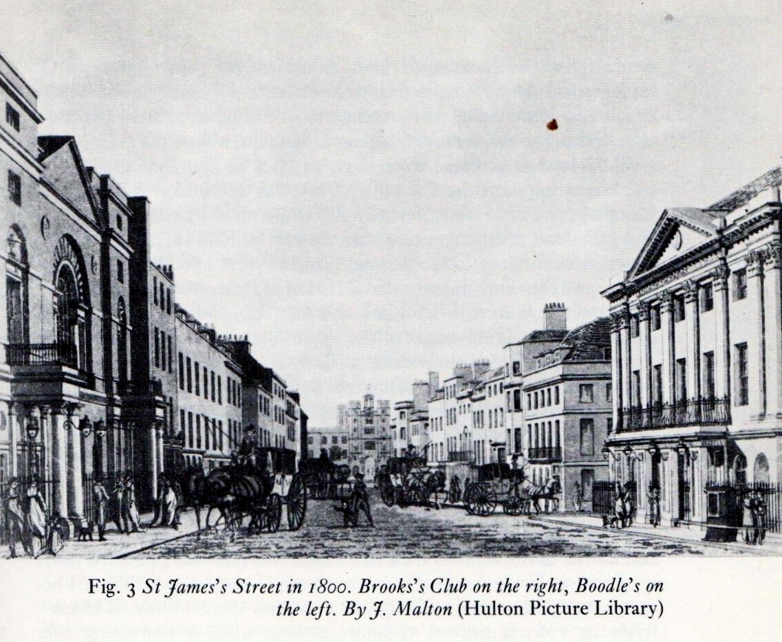 Society was dominated by the Dandies selfish pursuit of leisure and pleasure (The Pleasure Principal ) Gambling at the Clubs in St James's Street - White's, Boodles and Brooks's, made many seek King in Clarges Street to mortgage their estates or pledge their inherited gold and silver plate or their wives' diamonds at Hamlet, the jeweler in Cranbourn Alley or Rundell and Bridge at Ludgate Hillge who not only sold jewelry but trinkets of all kinds from seals to snuff boxes.