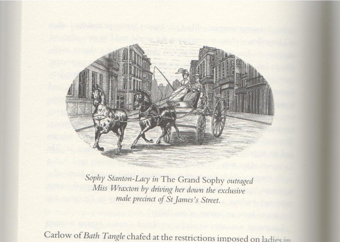 In Georgette Heyer's The Grand Sophy, Sophy Stanton Lacy outraged Miss Wraxton by driving her down the exclusive male precinct of St. James's Street.