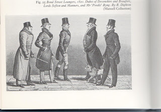 During the Regency, ape leader, Beau Brummel created a new simple and expensive style of dress. Absorbed with appearance, Brummel took five hours every morning at his toilet, bathing in eau-de-Cologne and water, then an hour at his hairdresser and two hours 'creasing down' his starched cravat until satisfied with the folds. He might discard a dozen or more cravats which he described as 'our failures' in the process. His obsession with fashion made the reputations of tailors, hatters, glovers and shirtmakers who gave him extensive credit in return form his custom.