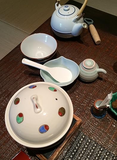 At an onsen hot springs resort in Hakone, the bath, the bed, the bamboo outside the balcony in the afternoon sun were all perfect. After soaking, napping and reading all afternoon, dinner started arriving at 6:45 promptly, just as the waitress said it would when she showed us to our room.