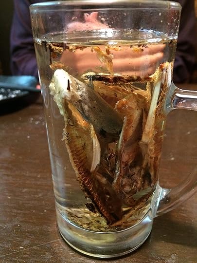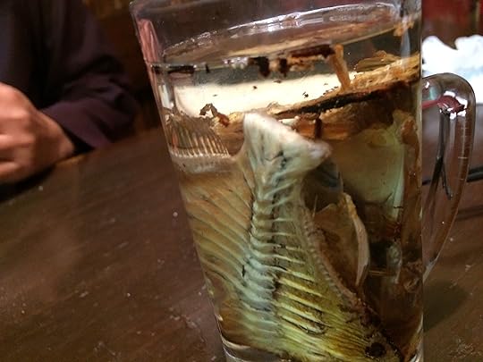 The waiter nodded approvingly when I ordered it, normally a sign that I’m in for something unique, something that “only Japanese would order.” I knew that to be the case with the bone sake when the waiter set the glass down on the table. It was clearly bones in sake, not some poetic, metaphoric name alluding to something different. It was a complete fish of bones soaking in a glass of clear alcohol, like a preserved specimen from some dusty nineteenth century laboratory.