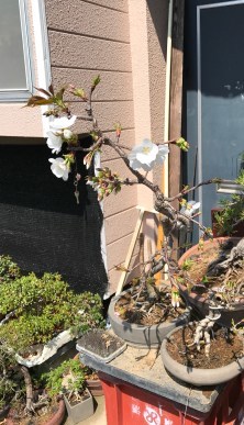 Because it’s the middle of hanami season, I asked if one with a wide, white blossom was a sakura. He told me it was only twenty years old and explained how hard sakura were to work with. You must start on them before the bark hardens or they won’t turn out interesting. He was disappointed in the one he had, because he had let it get too tall too fast.