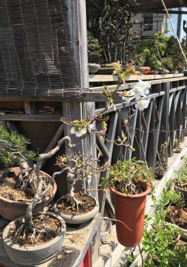 He pointed out another bonsai, down on the back shelf, out of the sunlight. Check out those blossoms, he said. I bent all the way over to look, but I couldn’t see them. He reached down and pushed one up with his rough fingers, and wiggled it back and forth. There were a dozen near-blossoms along the thin branches.