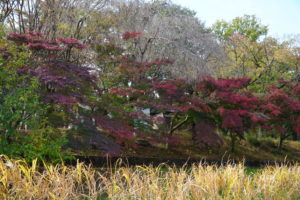 The autumn’s maple trees are just as common and colorful, though. Like cherry trees, they are often planted together, but they never seem to conform to a total group effect, but stand individually. They are often hidden behind other plants, leaning over bushes and spurting up behind other trees. Scarcely distinguishable the rest of the year, the maples take over after waiting patiently for the locust and gingko to drop their yellow. Then, as if to prove patience and stamina, and a keen sense of timing, the maples erupt everywhere.