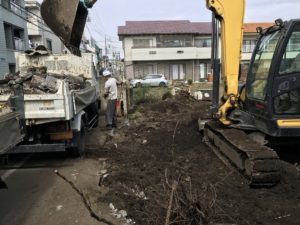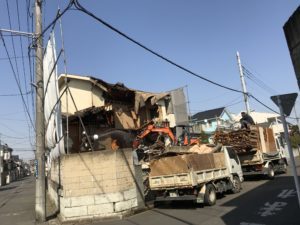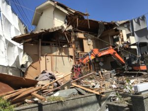 Most of the glass windows and wire guts have been removed before the real action gets underway. Pictures, decorations, furniture, tatami mats are left in place, not to mention toilets, plumbing and bathtubs, the metal of which crumples up like silver paper. The tile roof, which is heavy and dangerous, and no doubt a pain to clean up if shattered, is tossed hand to hand down to the truck. Once all that’s gone, a Japanese home is not much more than wood and memories.