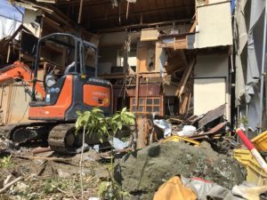 In one Toshiro Mifune film, he gets revenge on a rice-hoarding landlord by taking out the central pillar of his storehouse with a single swing of his sword. The roof and walls collapse and starving peasants surge in. I laughed the first time I saw that film, not believing it. But now I know it’s true. It’s not one sword cut, of course. It is a week of backhoe thrusts, a bit of yanking and tearing, along with some well-aimed hammering. And it’s over.