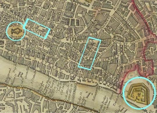 A close-up view of the 1799 map showing Cheapside and Gracechurch streets (in rectangles). St Paul’s Cathedral and the Tower of London are highlighted in circles.