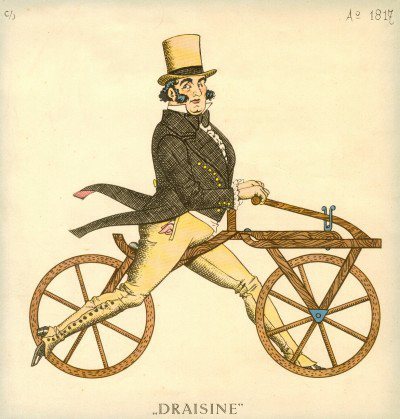 Of simple construction, it consisted of two wheels, with a saddle hung between them, the foremost of which could be made to turn by means of a bar. It was propelled by the rider’s feet on the road, and experts could achieve quite astonishing speeds, when, admirably balancing themselves, they would lift their feet from the ground and coast along at a great rate, and to the amazement of beholders.
