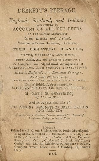 In a used book store in southern California I found a battered 1806 edition of Debrett’s Peerage of England, Scotland and Ireland. Here’s the title page: