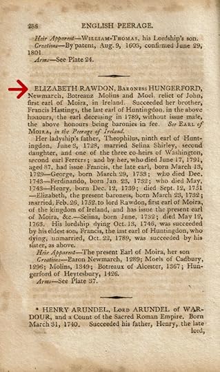 Like Sir Walter, my Debrett’s has given me “occupation for an idle hour” and I’m still discovering fascinating new bits of information in its pages; like this entry for Elizabeth Rawdon, Baroness Hungerford: