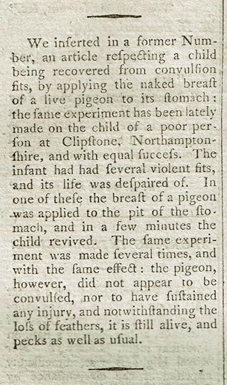 We inserted in a former Number, an article respecting a child being recovered from convulsion fits, by applying the naked breast of a live pigeon to its stomach: the same experiment has been lately made on the child of a poor person at Clipstone, Northamptonshire, and with equal success. The infant had had several violent fits, and its life was despaired of. In one of these the breast of a pigeon was applied to the pit of the stomach, and in a few minutes the child revived. The same experiment was made several times, and with the same effect: the pigeon, however, did not appear to be convulsed, nor to have sustained any injury, and notwithstanding the loss of feathers, it is still alive, and pecks as well as usual.